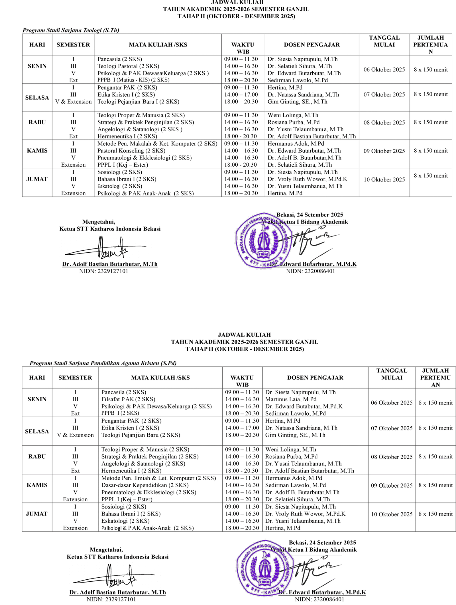 JADWAL KULIAH SEMESTER GANJIL TAHAP I & II 2025/2026